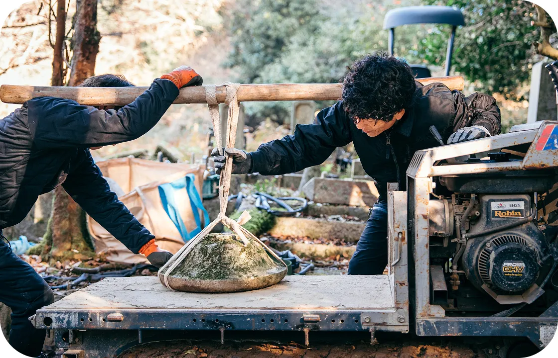長年の経験を生かし、墓石を一つひとつ丁寧に運搬。新しい土地の状態に合わせて基礎から再施工を行います。