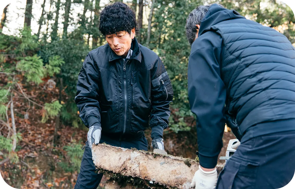 対応できます。弊社では、狭小地・傾斜地・山間部など特殊な現場にも対応できる設備と職人が揃っています。必要に応じて手作業での搬出を行い、安全かつ丁寧に作業を進めます。